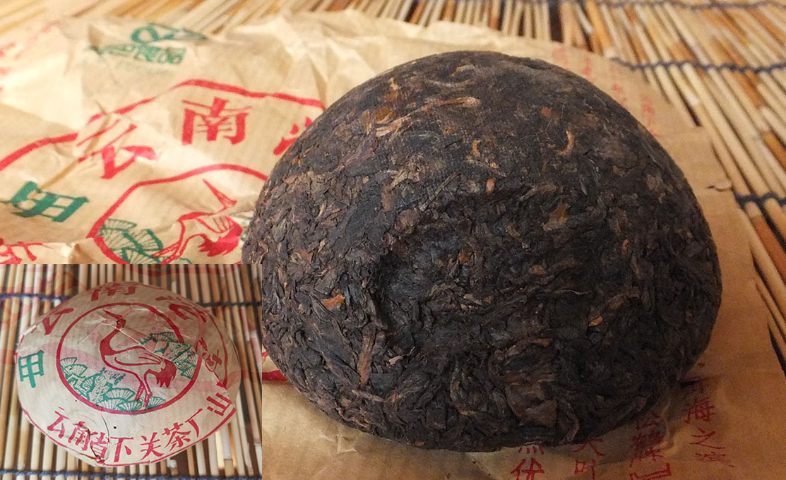 Hong Kong Traditional (Wet) Storage fundamentally is a process for conditioning young puerh tea under heat and humidity to age more quickly. This nurturing of microbial activity under the process can induce a white coating to form on the tea leaves. The resulting tea takes on a dark profile becoming soft and mellow, and developing a distinct age character that is unique to this tea category. - Photo 1990s Menghai Orange Label (HK Private Commission)
